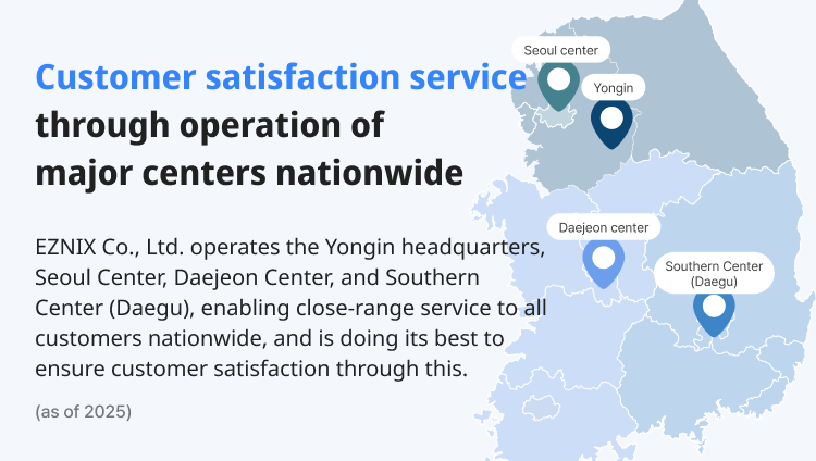 | Customer satisfaction service through operation of major centers nationwide EZNIX Co., Ltd. operates the Yongin headquarters, Seoul Center, Daejeon Center, and Southern Center (Daegu), enabling close-range service to all customers nationwide, and is doing its best to ensure customer satisfaction through this. (as of 2025) | ![]() |